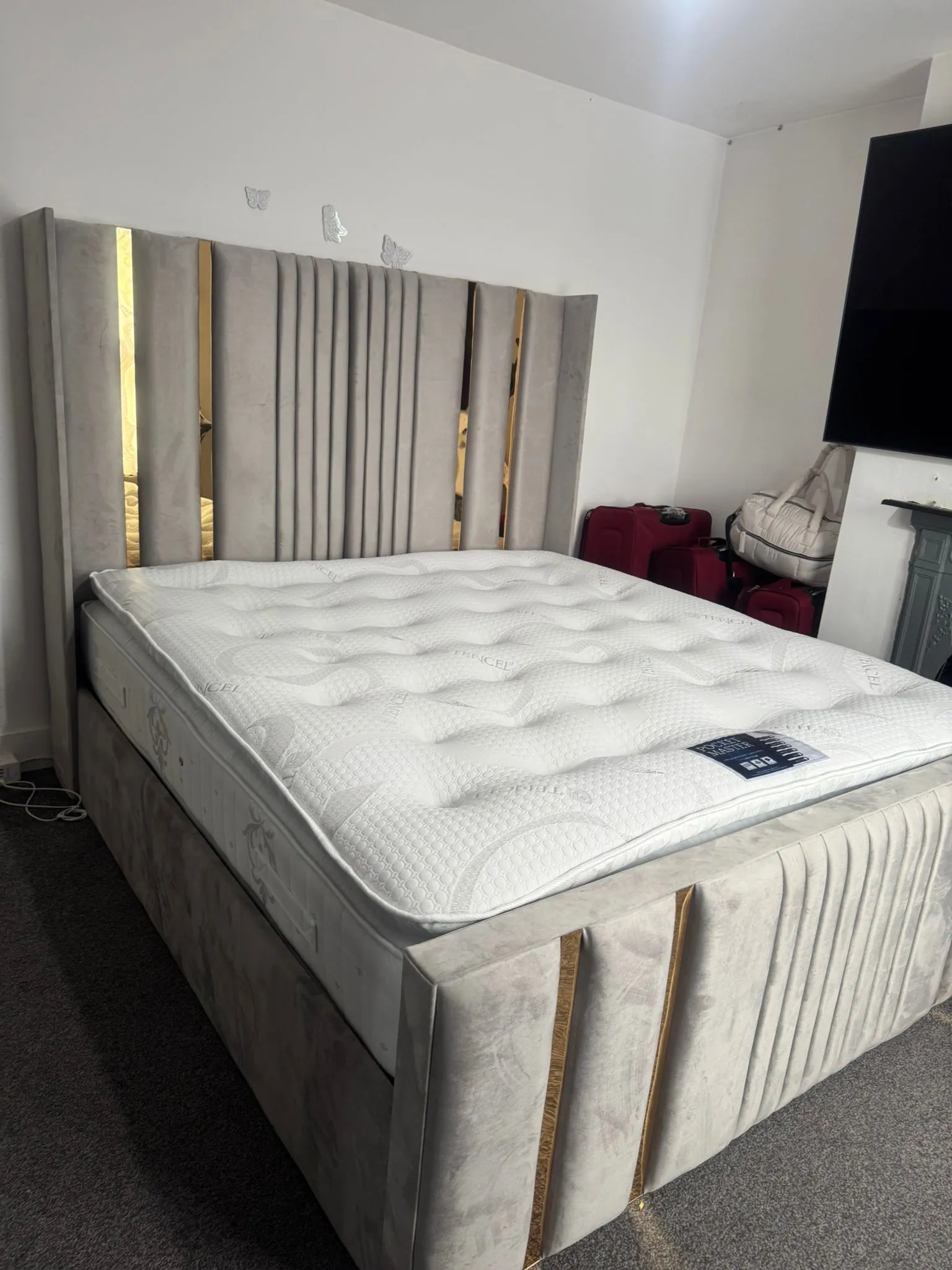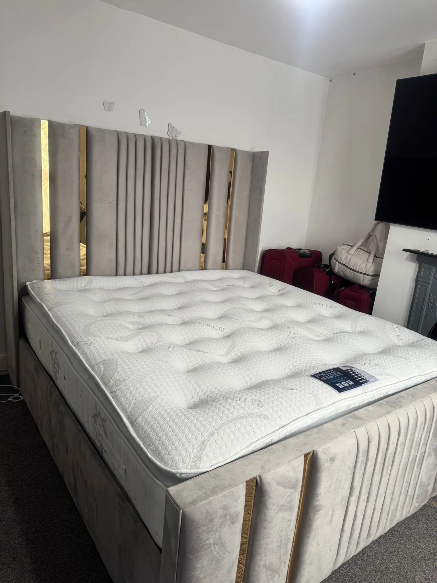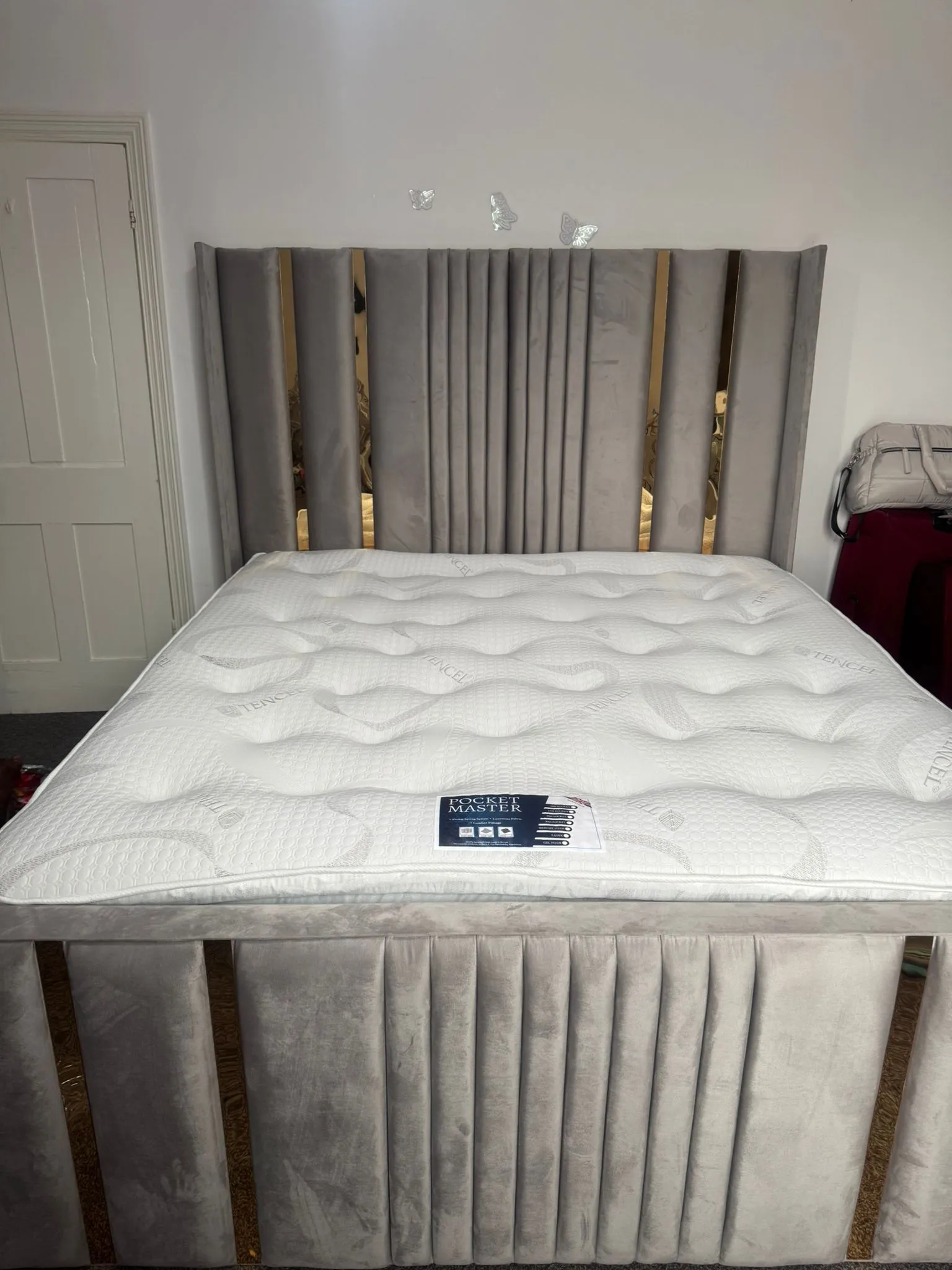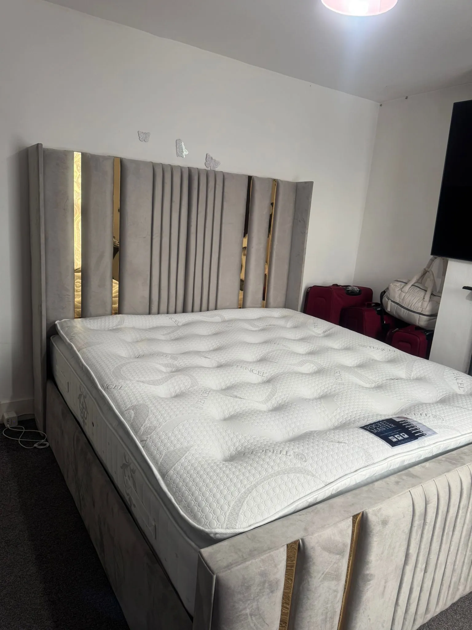 Introduce elegance and comfort to your bedroom with the Nova Wingback Bed Frame – a beautifully designed piece that combines modern luxury with practical functionality. The tall, winged headboard features deep vertical paneling and gold accent strips, creating a striking and stylish focal point for any room. Upholstered in premium soft-touch velvet, the Nova offers both sophistication and durability.