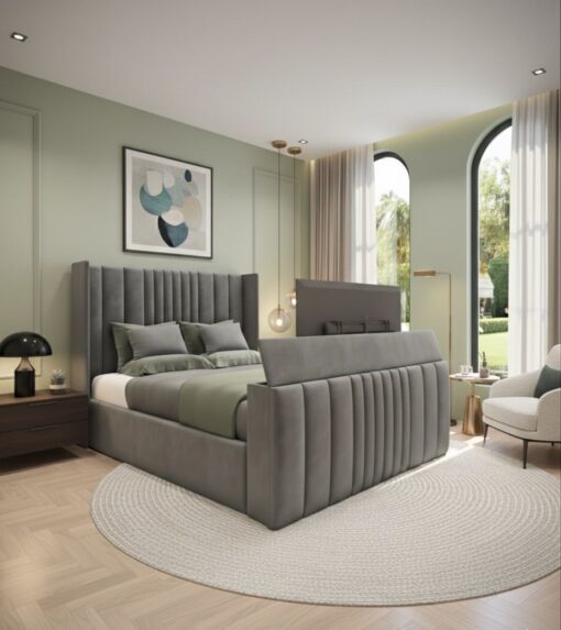 Experience the perfect blend of modern luxury and ultimate relaxation with the Seoul Wing TV Bed. Designed to transform your bedroom into a stylish entertainment retreat, this stunning bed features an elegant winged headboard and a smooth lift-up TV mechanism discreetly housed within the footboard.
